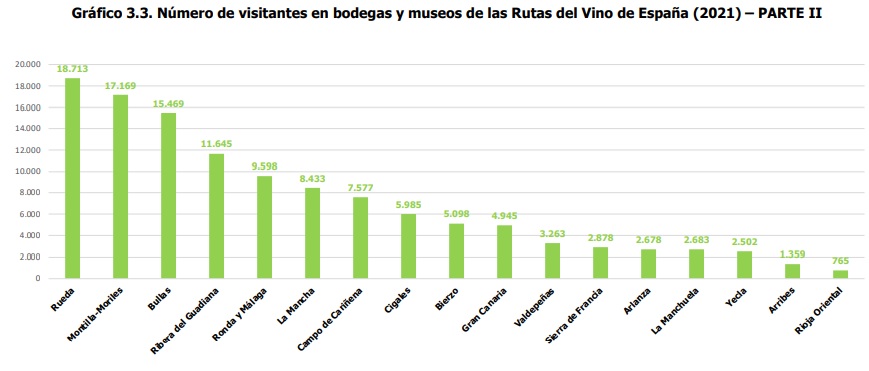 Así, durante el año 2021 las Rutas que han recibido un mayor número de visitantes han sido la Ruta del Vino de Calatayud, con 213.614 visitantes, seguida de la Ruta del Vino Ribera del Duero, con 197.145, y la Ruta del Vino y el Brandy del Marco de Jerez, con 186.670 visitantes. De manera desglosada, los primeros puestos en visitas a bodegas los ocupan la Ruta del Vino y el Brandy del Marco de Jerez, la Ruta del Vino Penedès y la Ruta del Vino Rioja Alta, seguidos de Ribera del Duero, Rioja Alavesa, Rías Baixas, Navarra, Somontano, Toro y Alicante. En cuanto a las visitas a museos del vino, el ranking lo lideran la Ruta del Vino de Calatayud, la Ruta del Vino Ribera del Duero y la Ruta del Vino de la Garnacha-Campo de Borja. Aquí cabe destacar el crecimiento experimentado por Rutas como Jumilla y Rías Baixas.