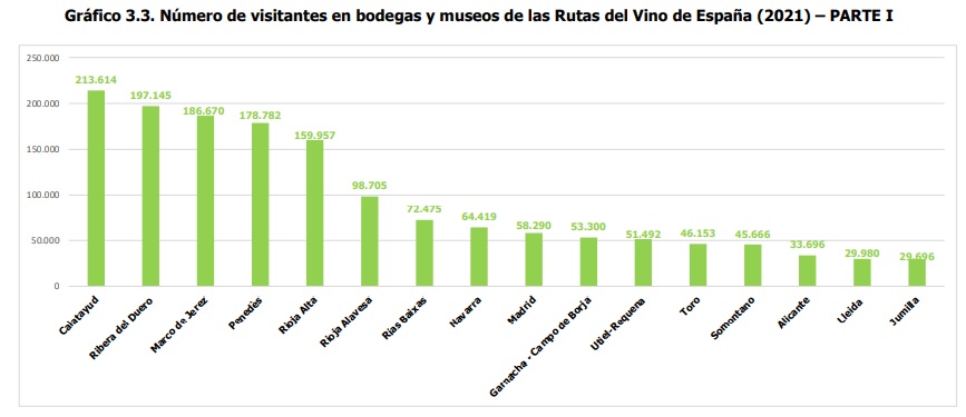 Así, durante el año 2021 las Rutas que han recibido un mayor número de visitantes han sido la Ruta del Vino de Calatayud, con 213.614 visitantes, seguida de la Ruta del Vino Ribera del Duero, con 197.145, y la Ruta del Vino y el Brandy del Marco de Jerez, con 186.670 visitantes. De manera desglosada, los primeros puestos en visitas a bodegas los ocupan la Ruta del Vino y el Brandy del Marco de Jerez, la Ruta del Vino Penedès y la Ruta del Vino Rioja Alta, seguidos de Ribera del Duero, Rioja Alavesa, Rías Baixas, Navarra, Somontano, Toro y Alicante. En cuanto a las visitas a museos del vino, el ranking lo lideran la Ruta del Vino de Calatayud, la Ruta del Vino Ribera del Duero y la Ruta del Vino de la Garnacha-Campo de Borja. Aquí cabe destacar el crecimiento experimentado por Rutas como Jumilla y Rías Baixas.